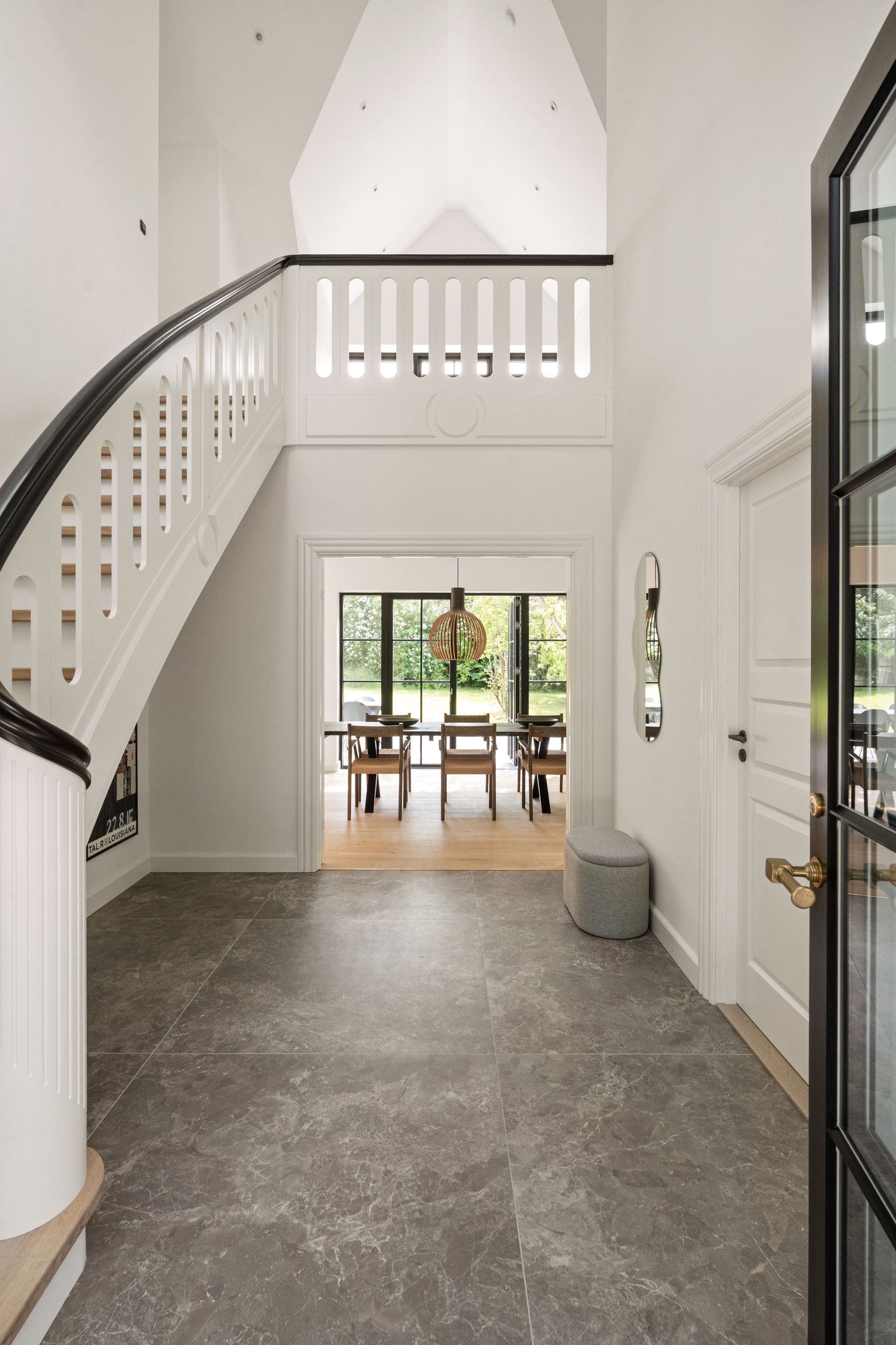 Den rummelige og imponerende hall med over 8 meter til loftet signalerer stil og klasse, og i stuen er loftshøjden ligeledes hævet. Der er gulvvarme i hele huset via en luft-til-vand varmepumpe – det sikrer en høj komfort og en behageligt lav varmeregning.