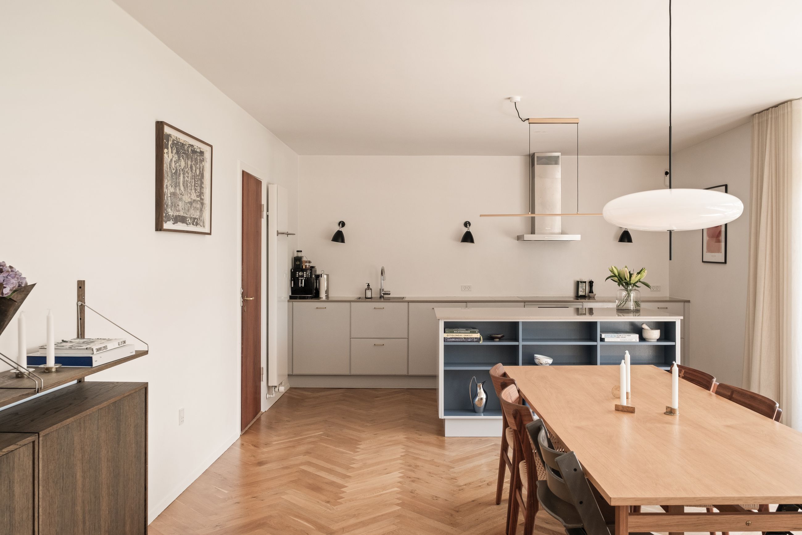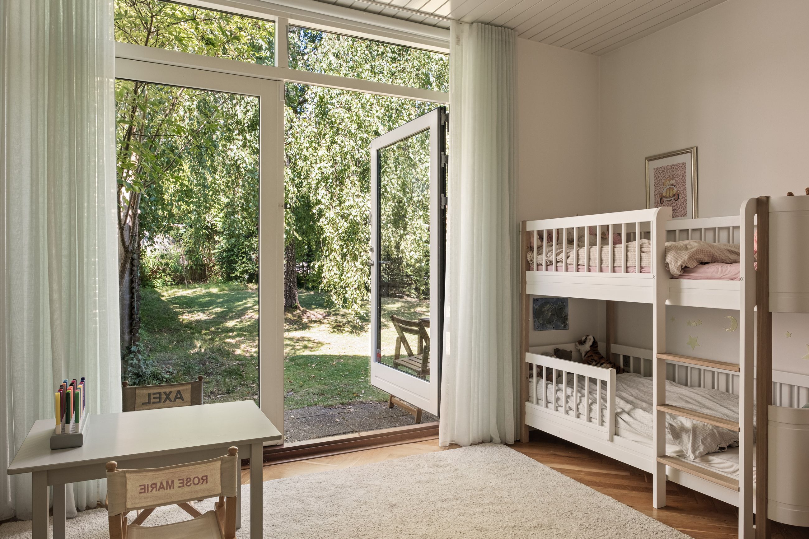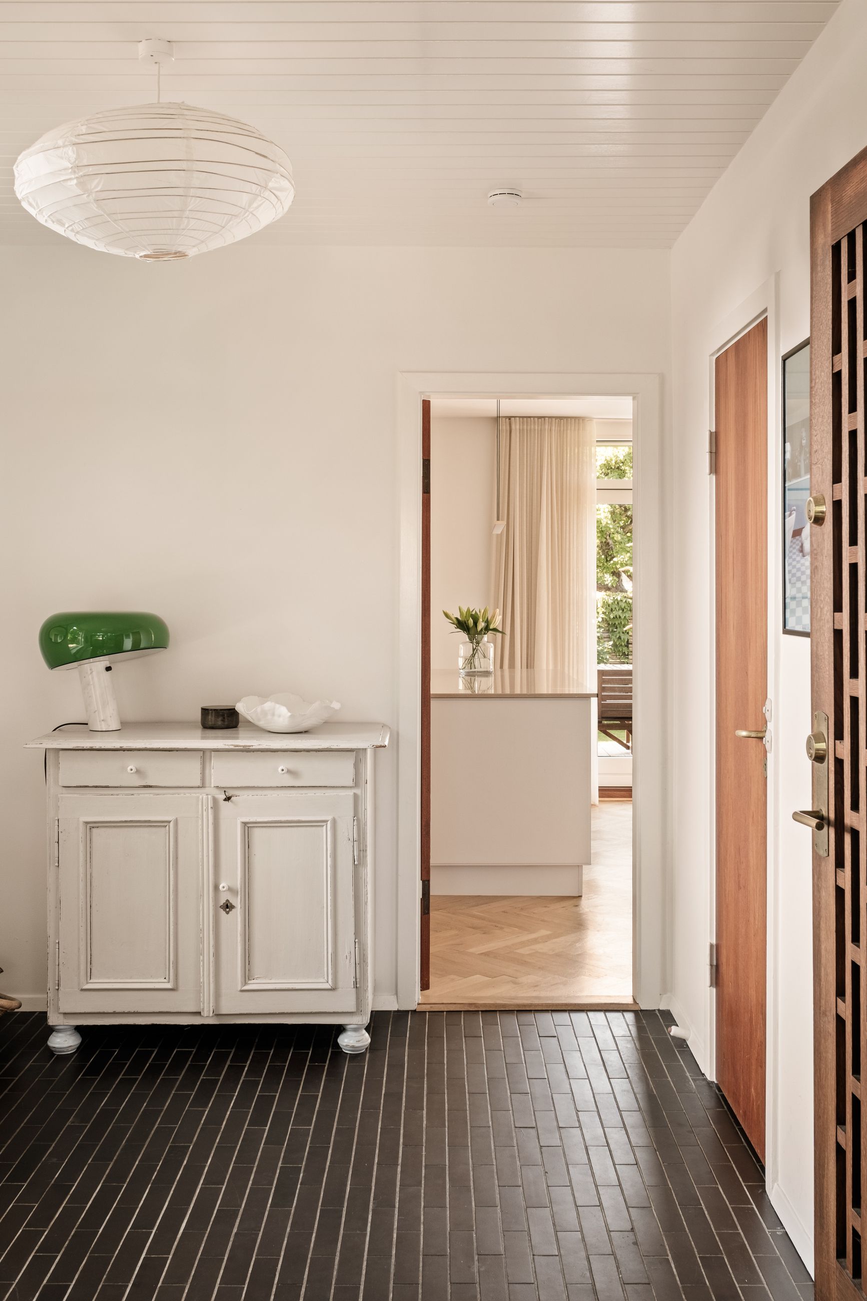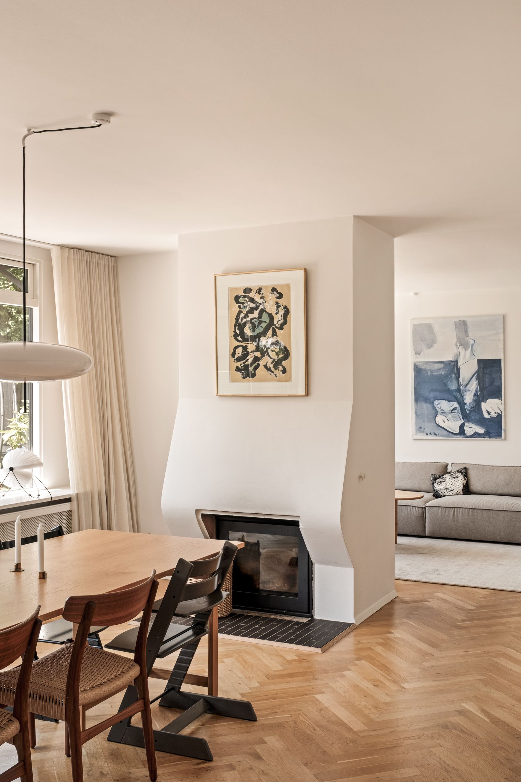 Indenfor mødes du af en lys og indbydende indretning, hvor de smukke sildebensparketgulve understreger den tidløse elegance. Planløsningen er ideel med tre gode soveværelser og en rummelig stue, som giver plads til både familieliv og gæster. Badeværelset fremstår stilrent og funktionelt, og derudover er der et praktisk gæstetoilet, som gør hverdagen mere bekvem.