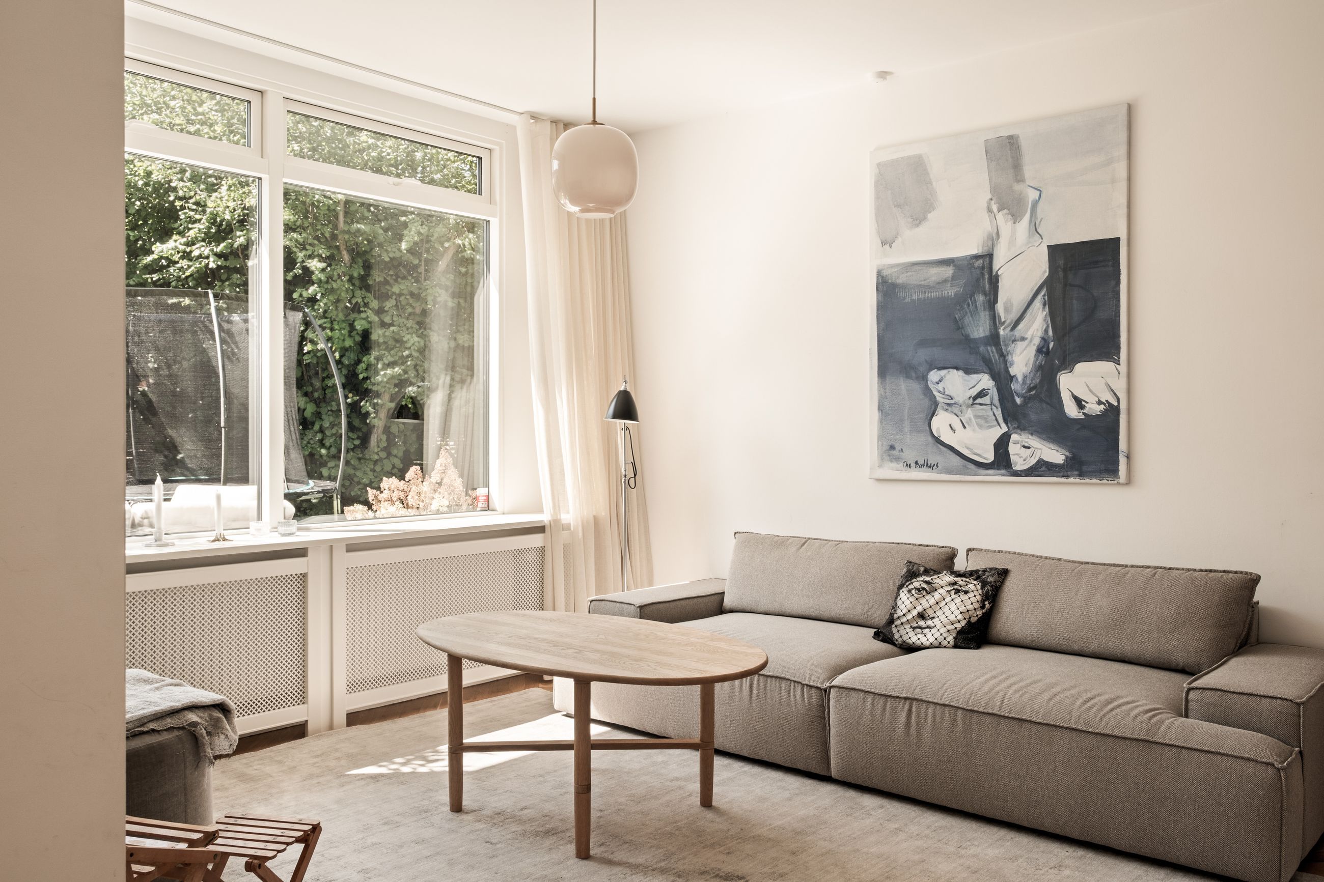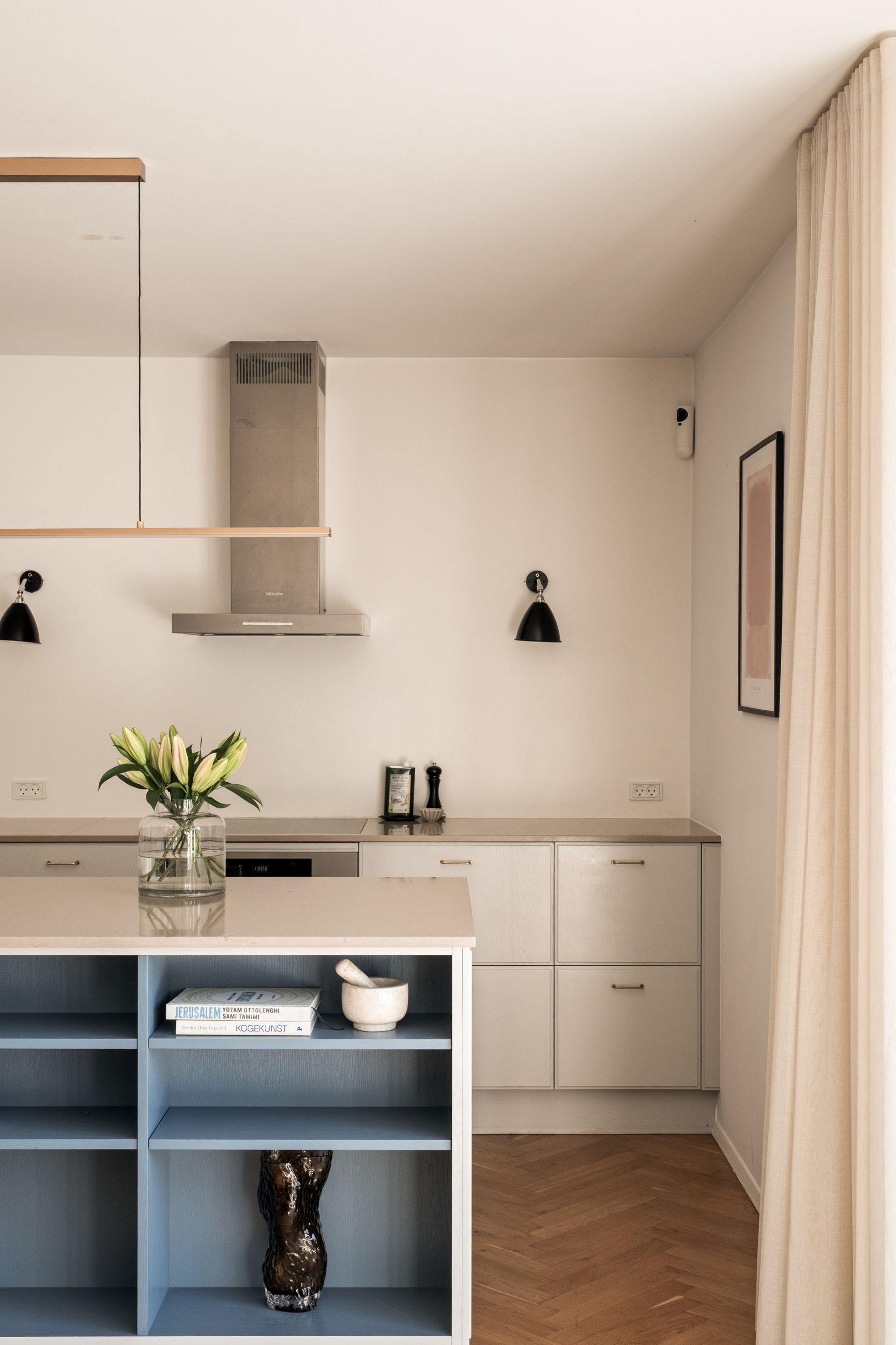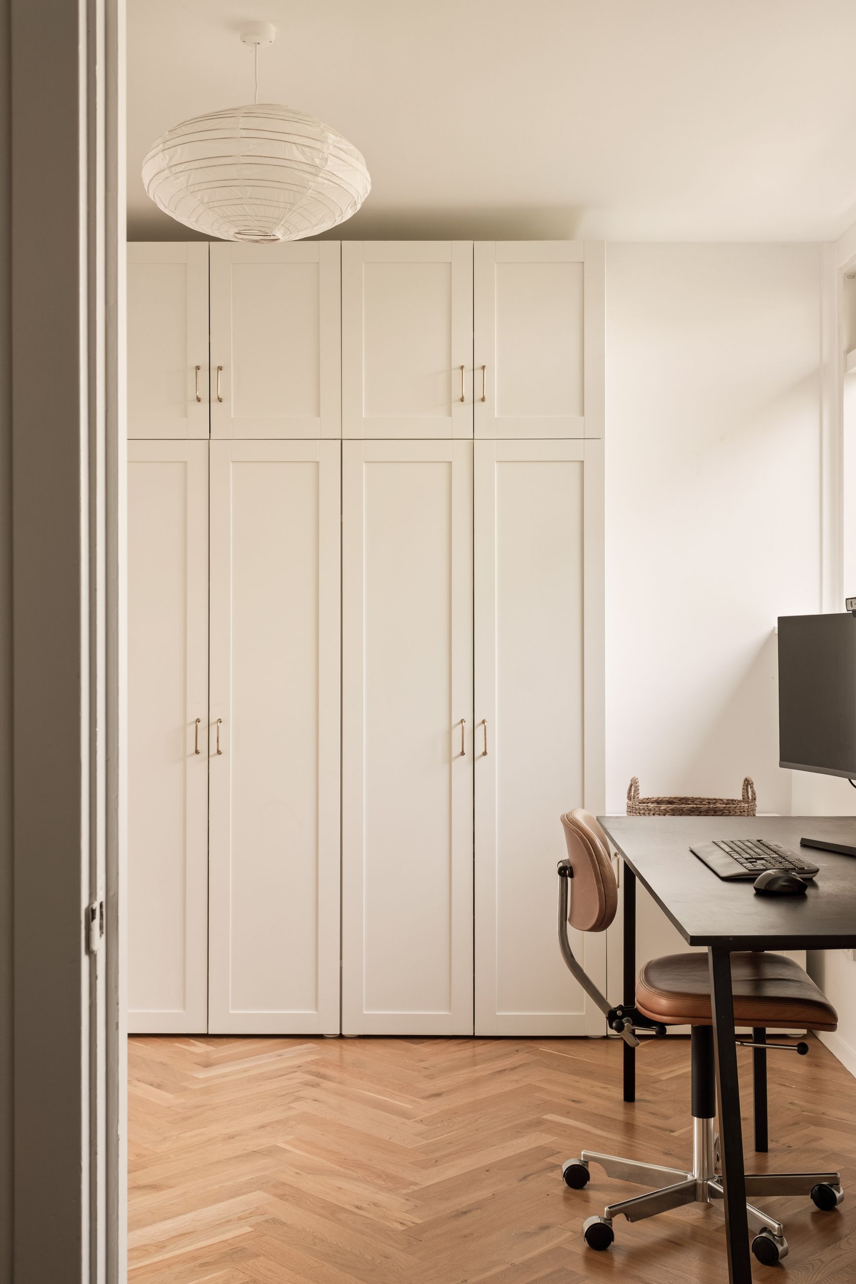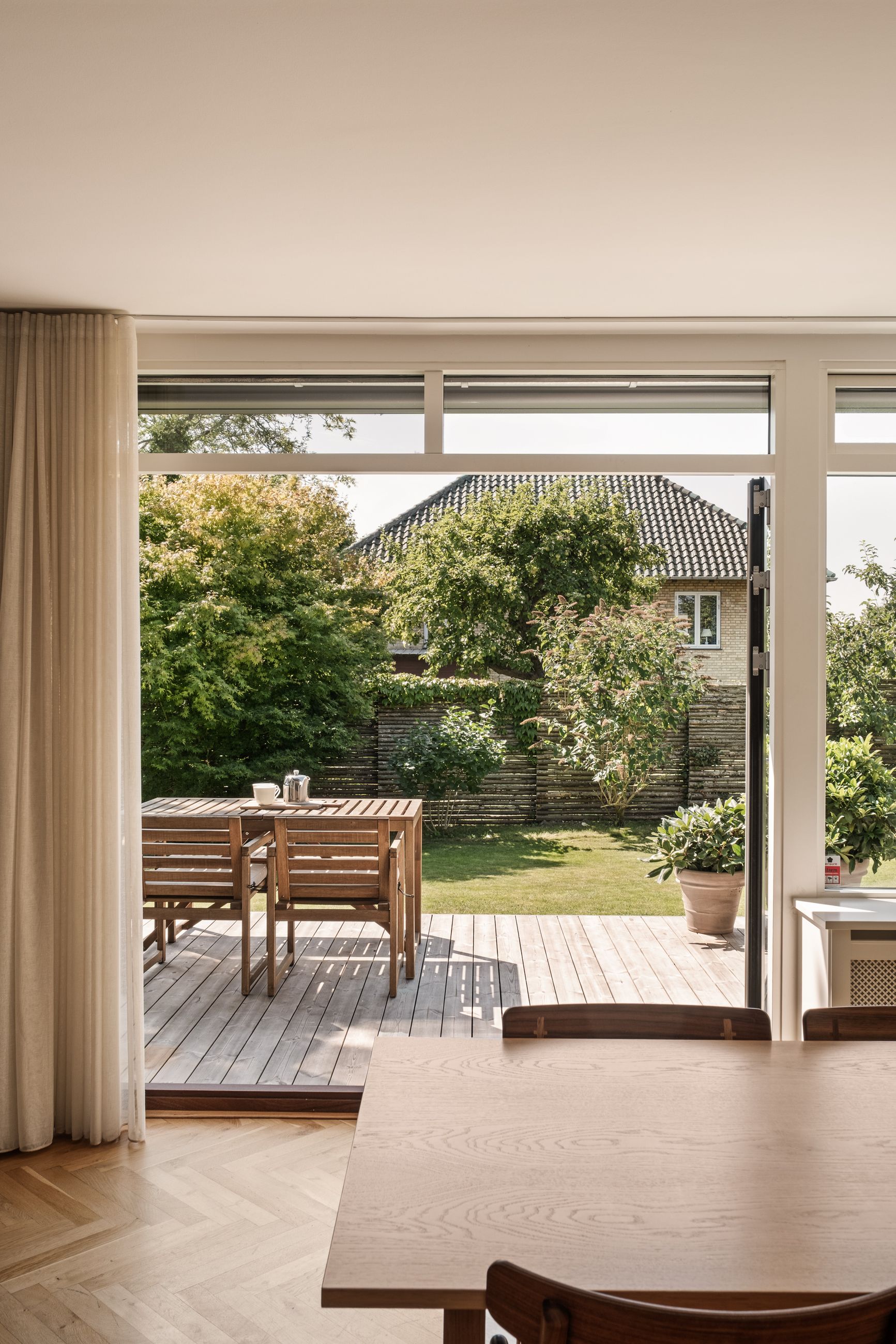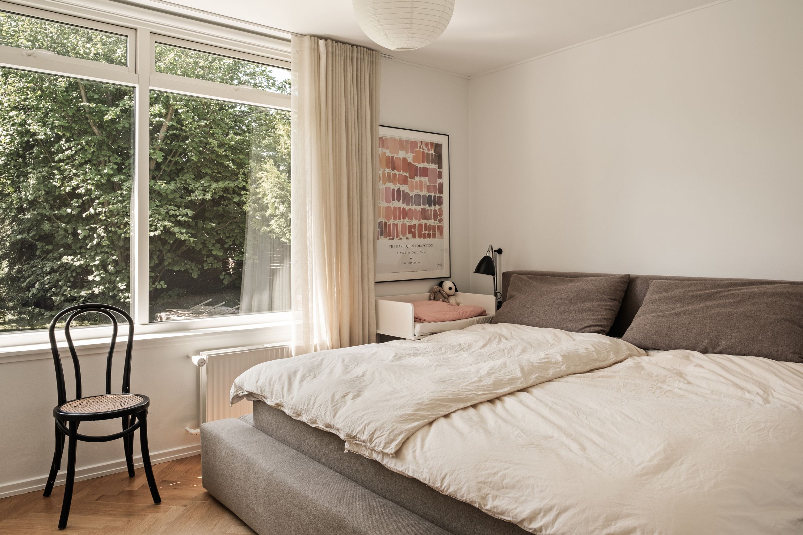 Indenfor mødes du af en lys og indbydende indretning, hvor de smukke sildebensparketgulve understreger den tidløse elegance. Planløsningen er ideel med tre gode soveværelser og en rummelig stue, som giver plads til både familieliv og gæster. Badeværelset fremstår stilrent og funktionelt, og derudover er der et praktisk gæstetoilet, som gør hverdagen mere bekvem.
