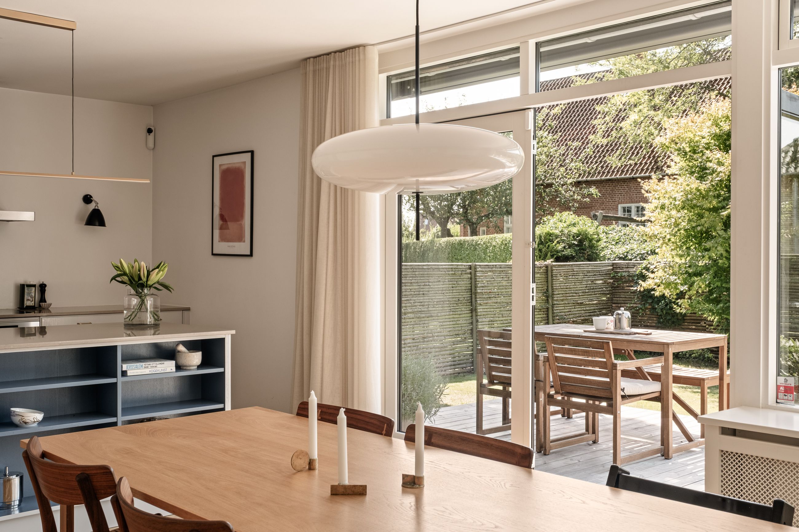 Husets samlingspunkt er køkken-alrummet med køkken fra Stillark. Her kan du tilberede lækre måltider, mens du er en del af samtalen omkring spisebordet, hvor en hyggelig pejs skaber varme og stemning. Fra alrummet er der direkte udgang til den sydvendte terrasse og den skønne have, som indbyder til solrige dage, afslapning, leg og sociale sammenkomster.
