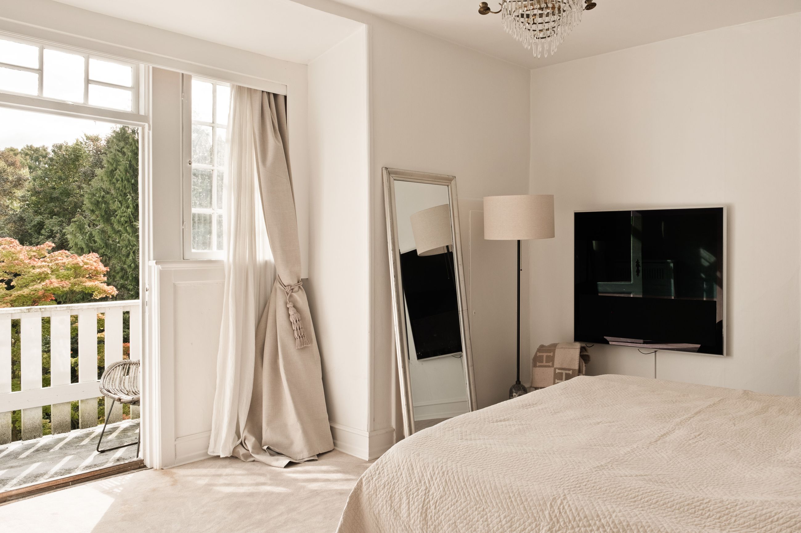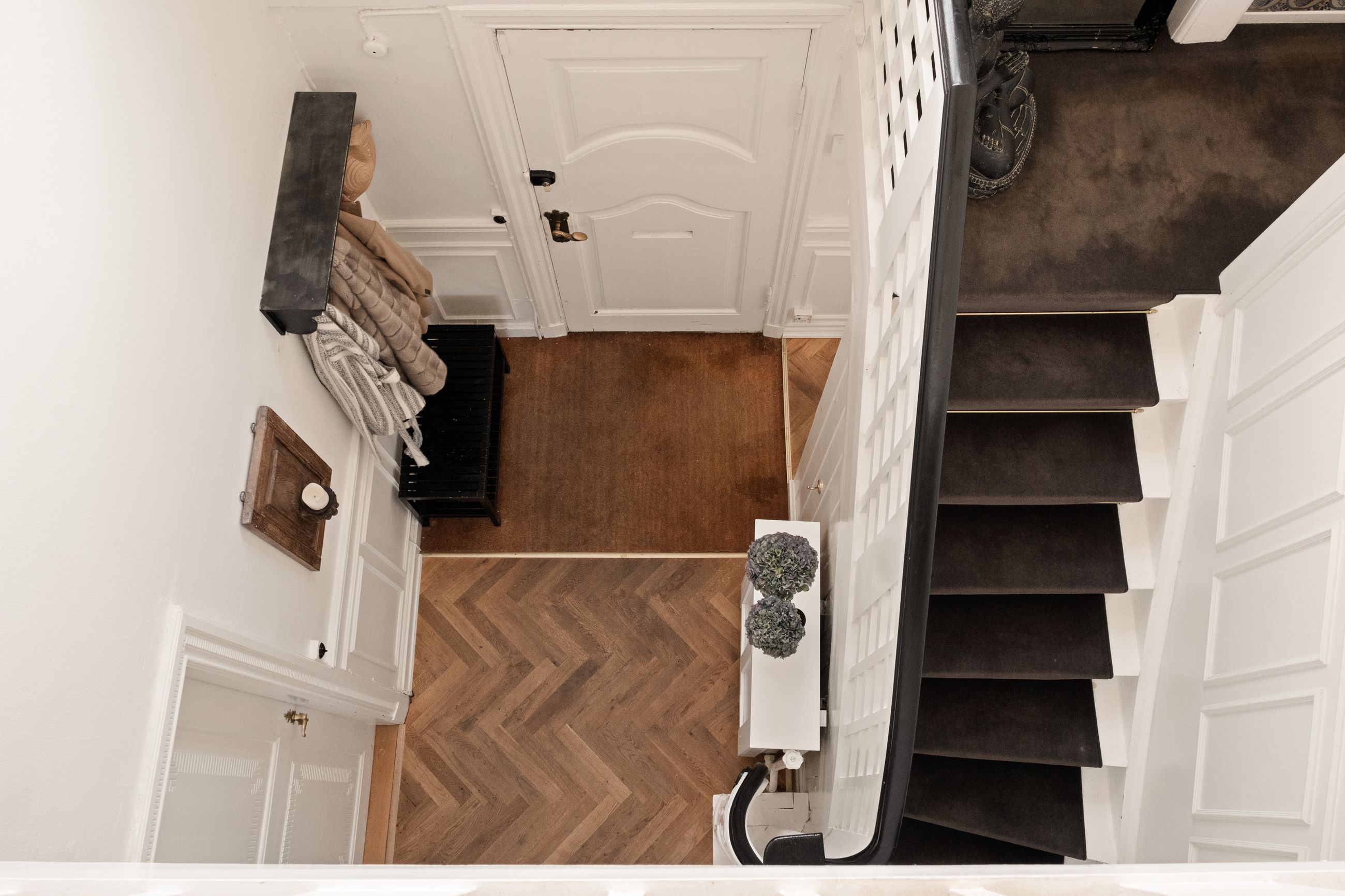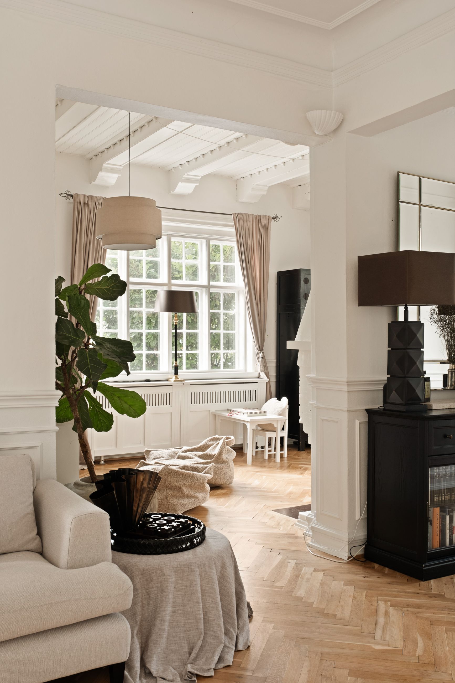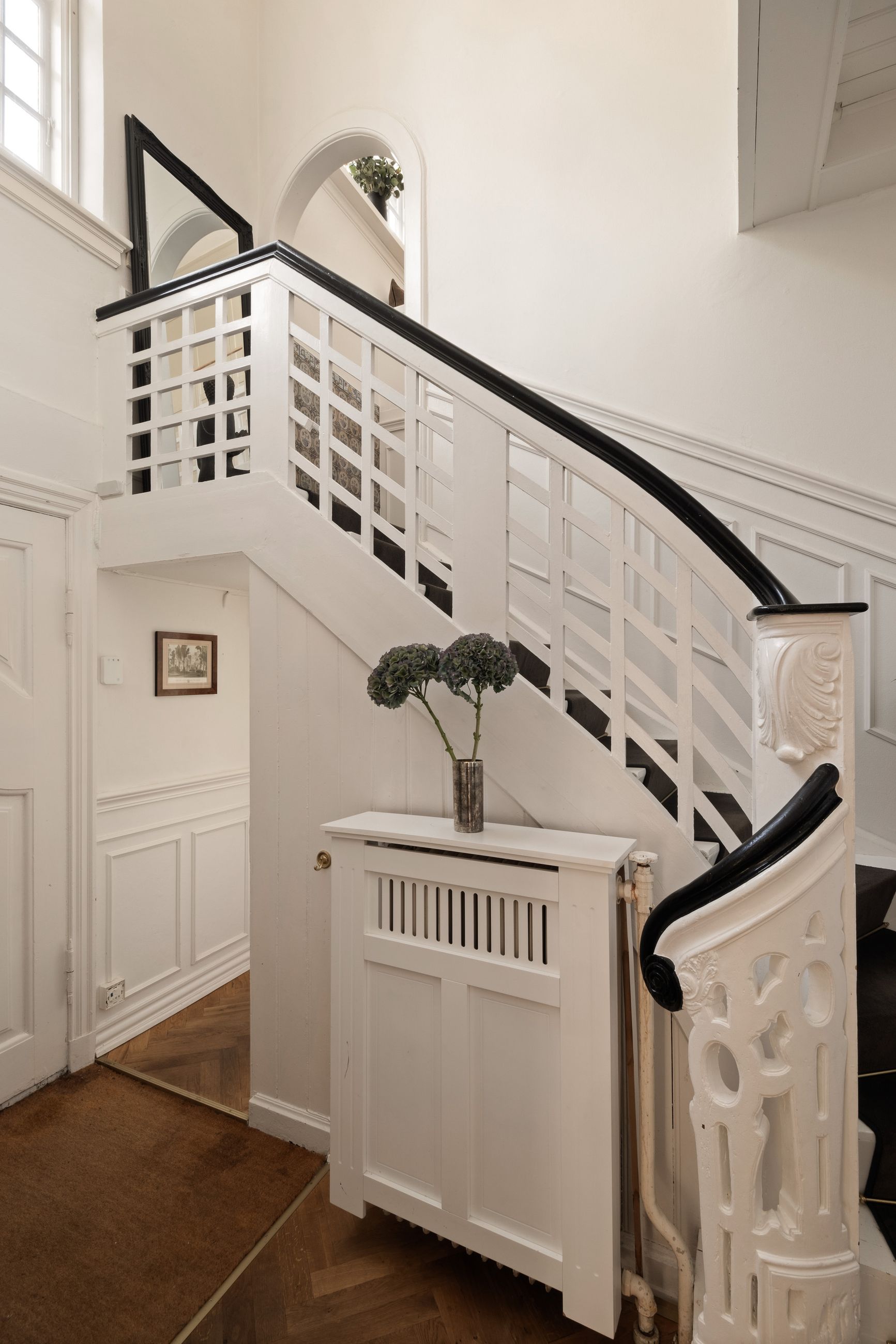Indenfor mødes du af lyse, højloftede stuer med sprossede vinduer, stuk og smukke originale detaljer, der alt sammen spiller op til det bløde dagslys. Pejsen i stuen indbyder til langsomme aftener, mens de store, sammenhængende opholdsrum gør det oplagt at samle venner og familie til middage og samtaler, der varer til sent.