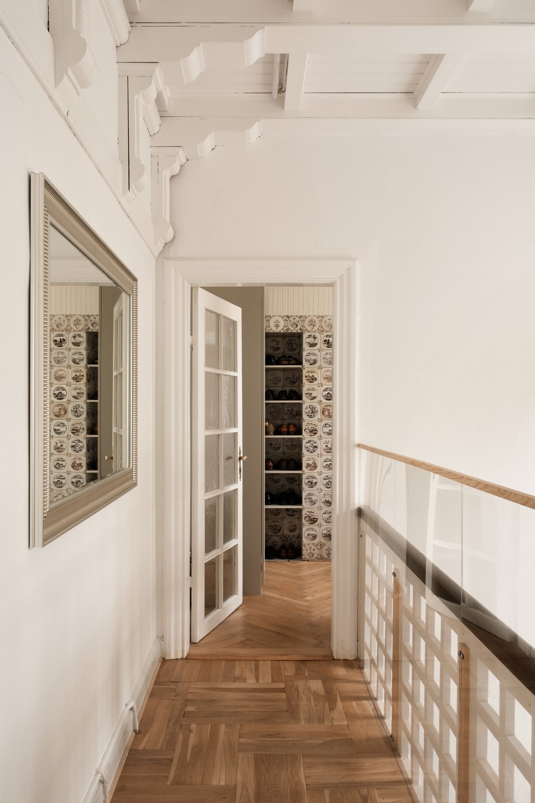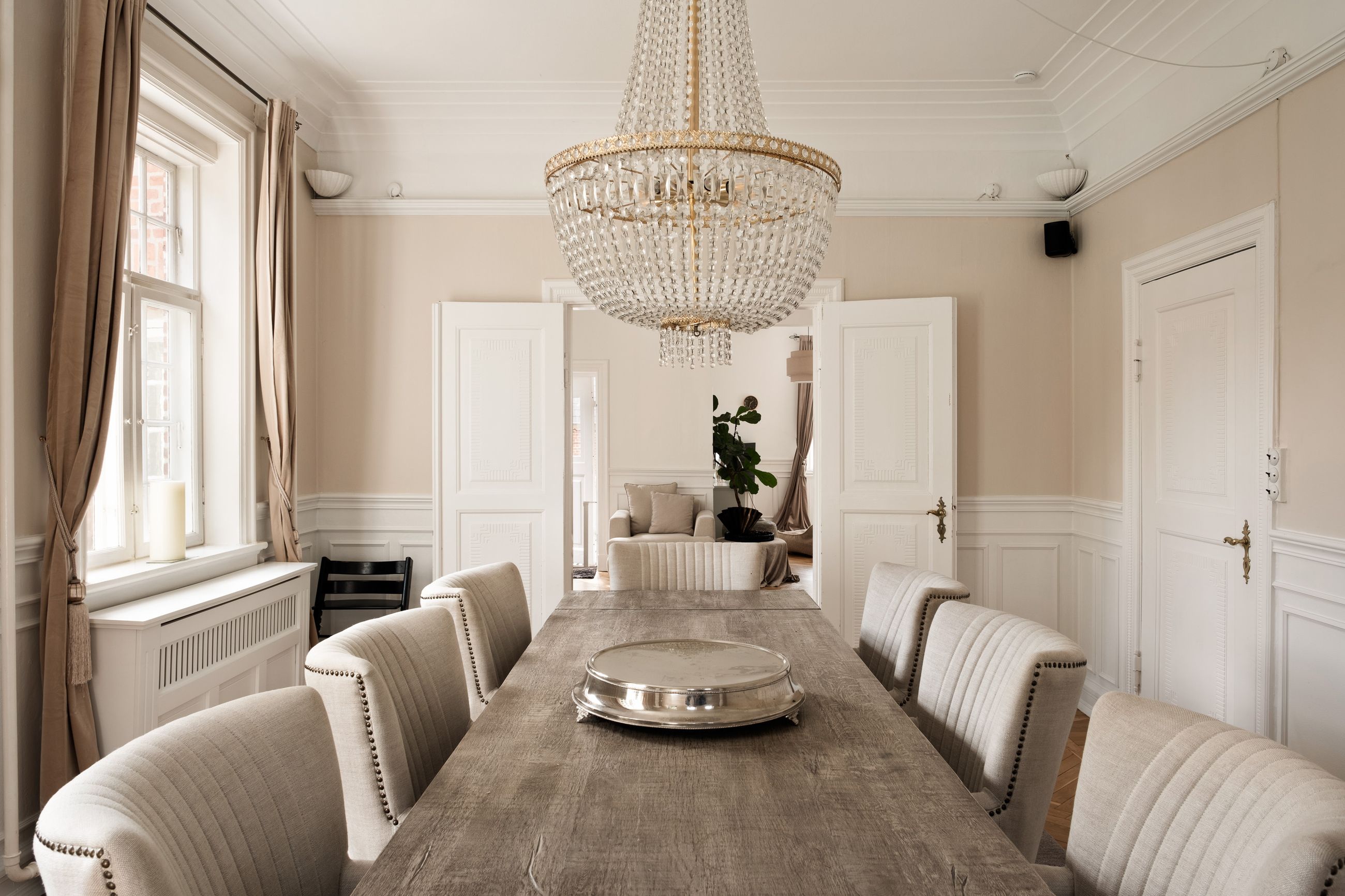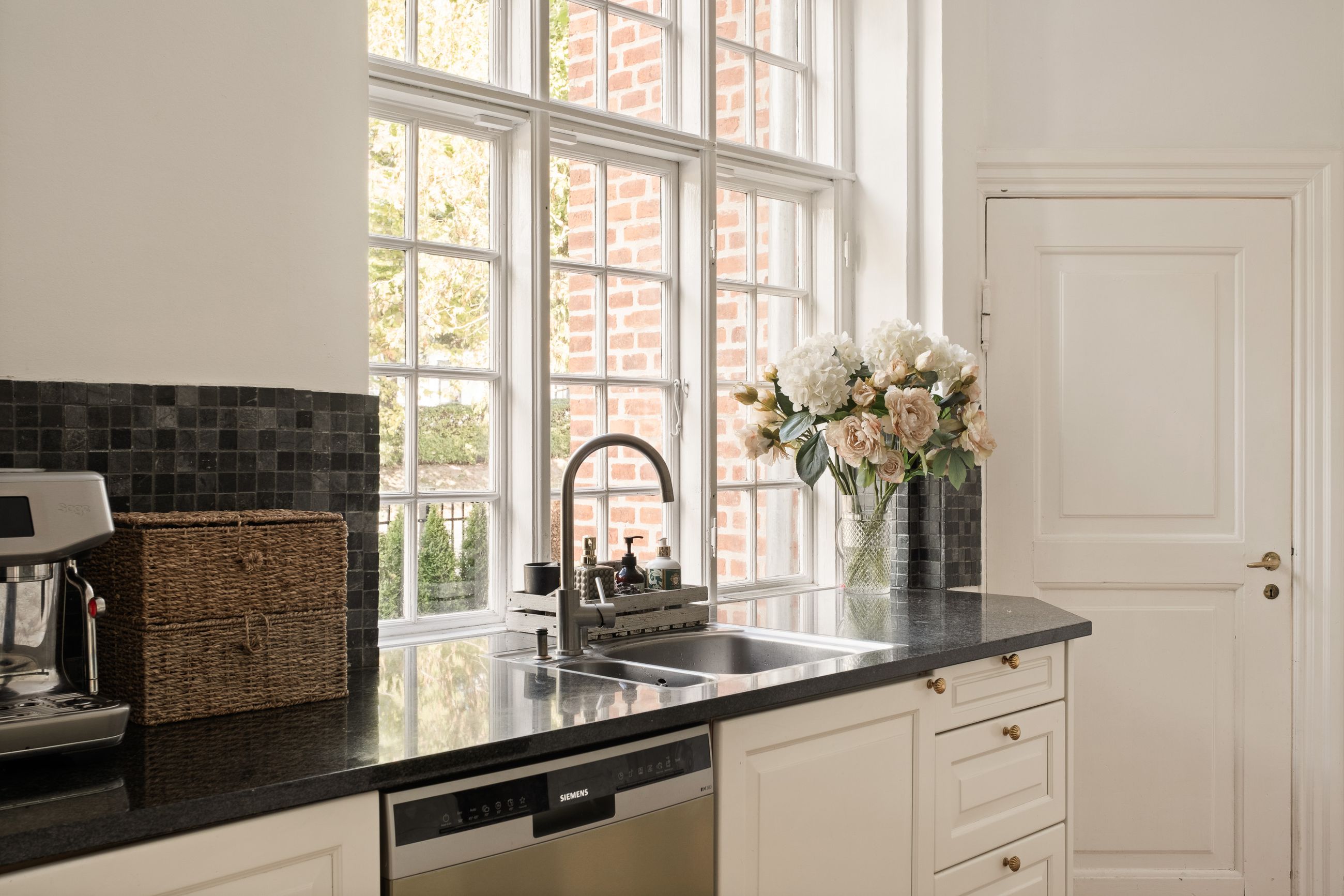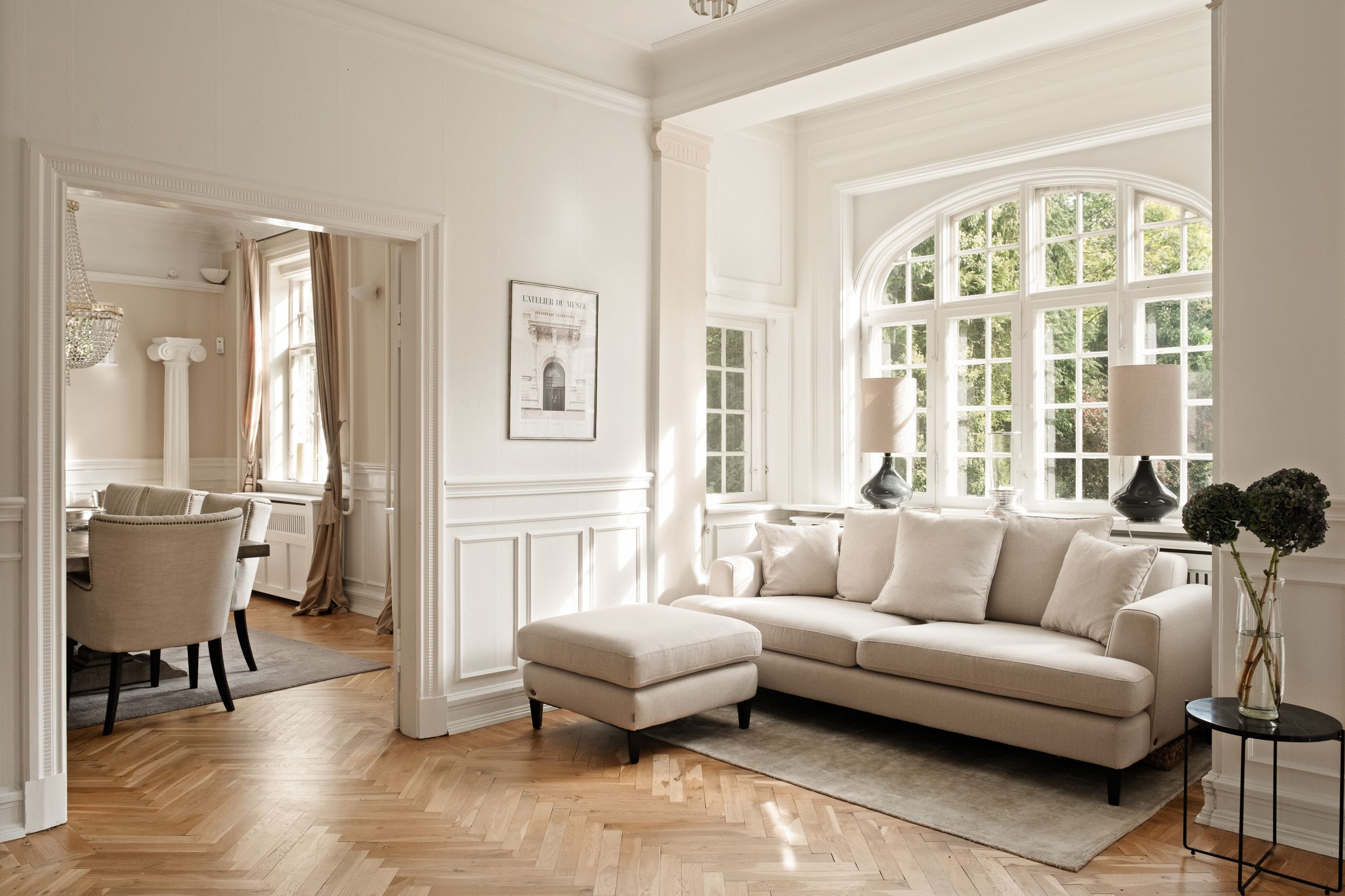 Indenfor mødes du af lyse, højloftede stuer med sprossede vinduer, stuk og smukke originale detaljer, der alt sammen spiller op til det bløde dagslys. Pejsen i stuen indbyder til langsomme aftener, mens de store, sammenhængende opholdsrum gør det oplagt at samle venner og familie til middage og samtaler, der varer til sent.