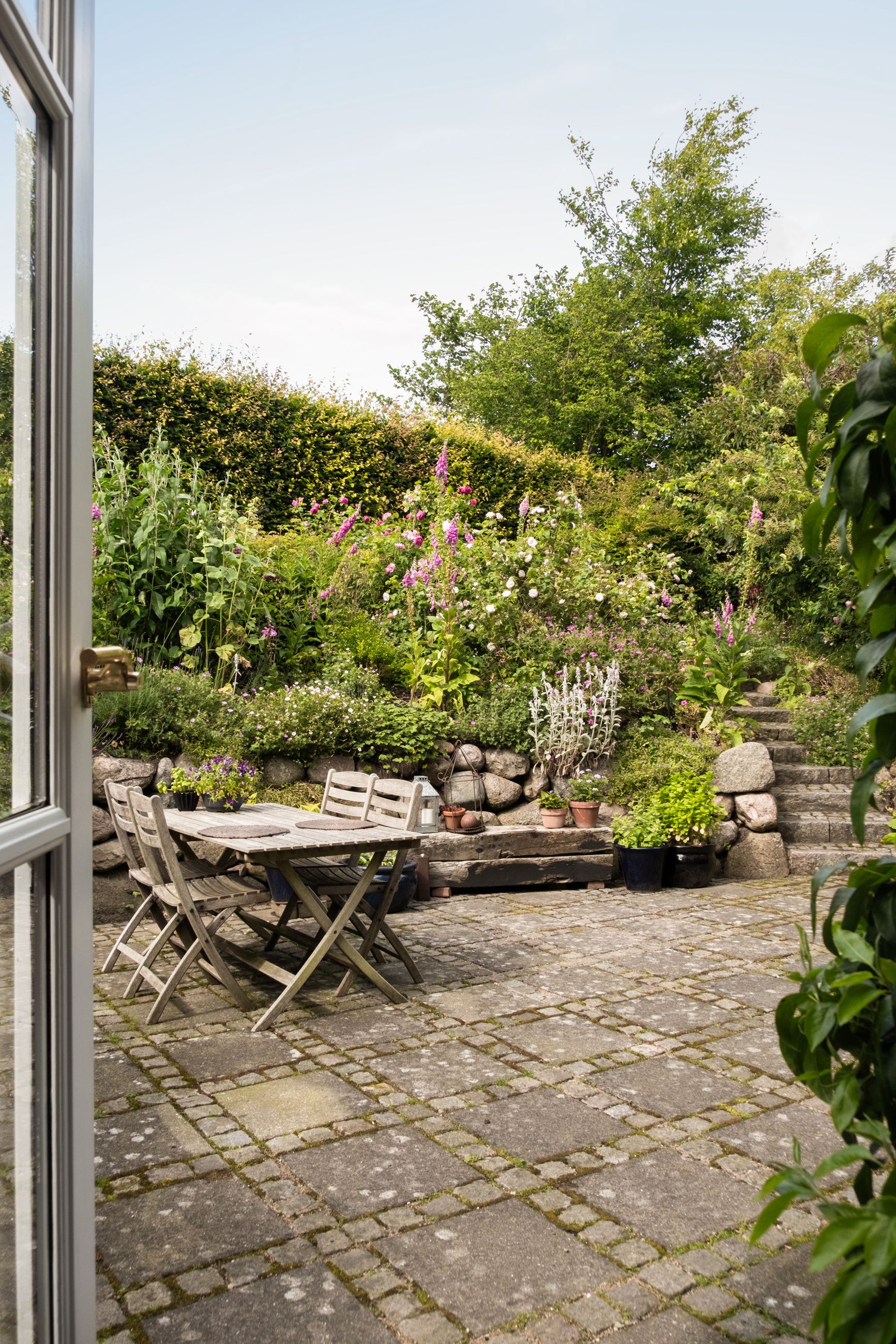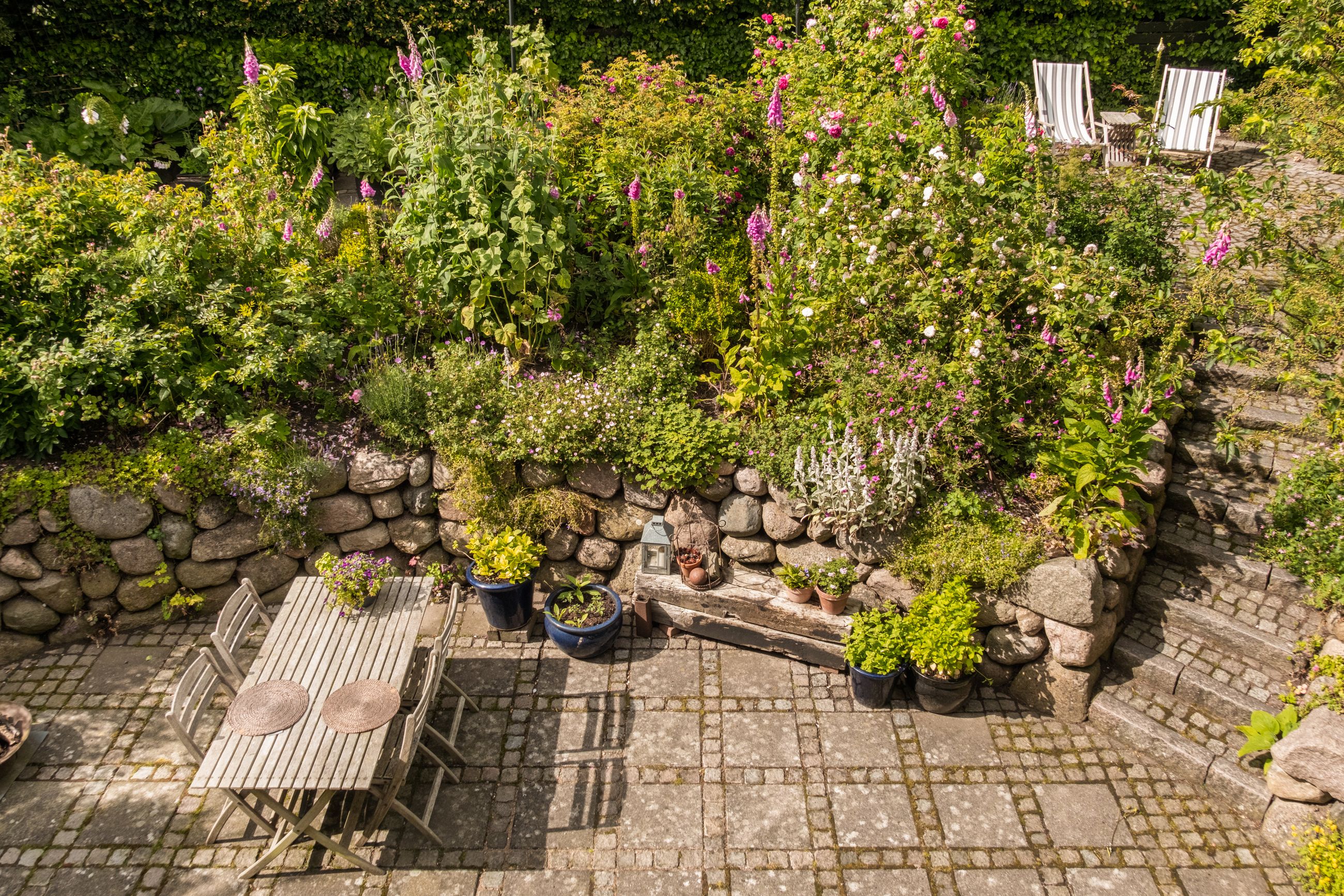 Og haven! Det skrånende areal bag huset blev med tiden og flid omdannet til en grøn bagvæg med niveauer, stensætninger og blomstrende vækster, hvor en morgen med kaffen i den ene hånd og den heldige udkårne i den anden bliver en livsforlængende lykkestund med masser af ro og privathed til at nyde grønheden og stilheden.
